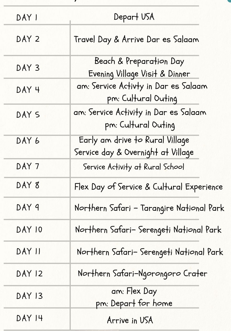 After days of meaningful service and cultural connection, we’ll end our journey with an unforgettable safari adventure—tracking the legendary Big Five across Tanzania’s breathtaking landscapes and soaking in the wild beauty of Africa.